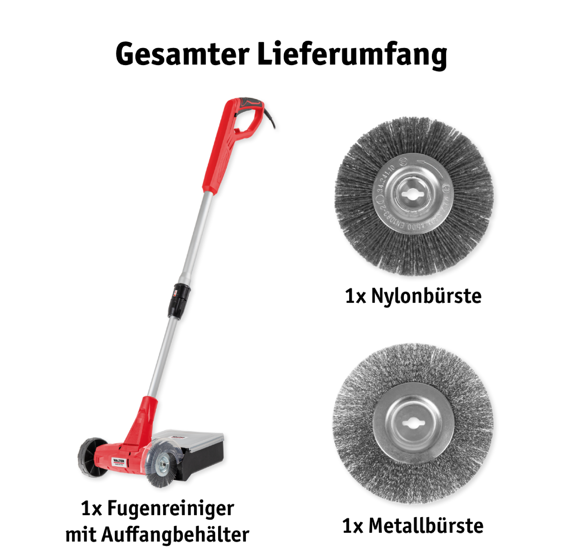 Enthalten sind 22 Stück WALTER 2in1 Fugenreiniger mit Fangbox für mühelose Reinigung von Pflasterfugen und Gehwegen sowie 1 hochwertige Werkstatt-Rollliege für ergonomisches Arbeiten unter Fahrzeugen und Maschinen.